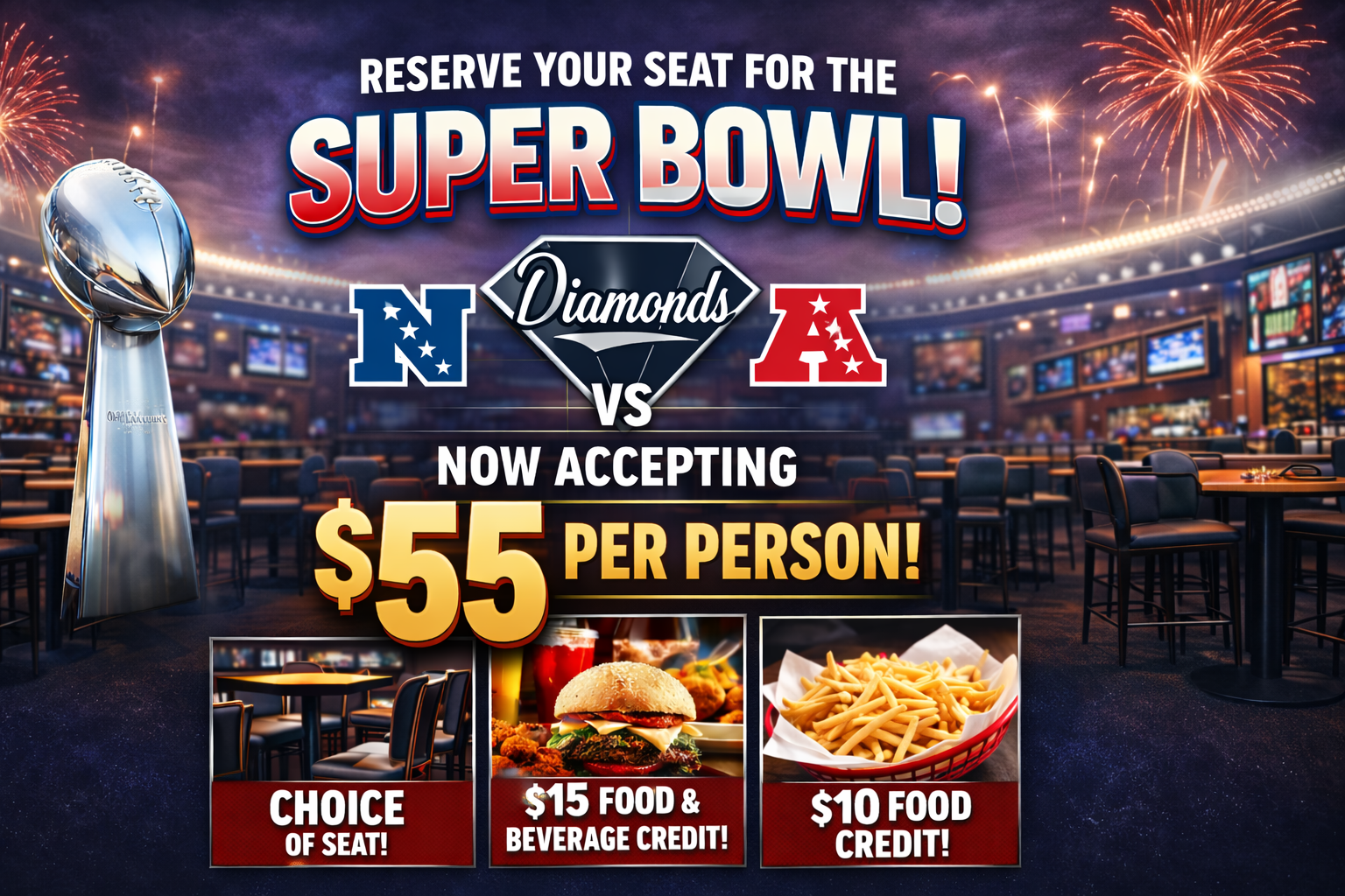 Diamonds is now accepting reservations for Super Bowl in person. No over the phone reservations are accepted. The cost is $55 per person and comes with $25 in credits towards food and beverage ($10 minimum food), plus you get a choice of table or seat at the bar. Must reserve full tables and cash only, no credit cards or refunds. Mahalo and hope to see you at the big game.